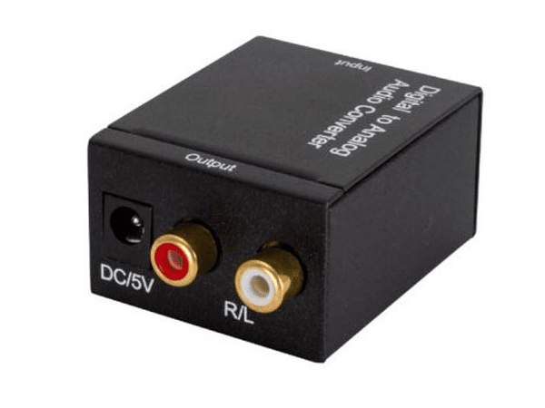 Adaptador de audio digital (toslink) y coaxial a analógico a través de RCA.