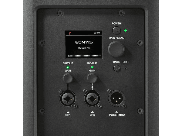 Este nuevo modelo posee un woofer de 15 pulgadas, bocina de alta frecuencia rediseñara y una potencia en rms de 650w. Una de sus nuevas y mejoradas características es que posee bluetooth para ecualizar a través de la app incluida de JBL y transmitir audio, además su función de atenuación permite disminuir el volumen si detecta voz. Cuenta con un control de volumen master, dos canales con control de volumen independiente y una conexión para puentear otro parlante Eon 715 (copia de señal).