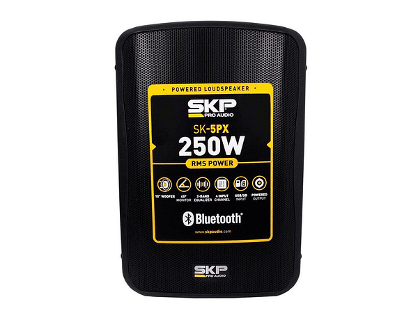 El SK 5PX Bk de SKP es un parlante activo que cuenta con un woofer de 15 pulgadas y entrega una potencia de 250w rms a 8 ohms. Su estructura es de plástico reforzado resistente y duradero, posee conexión vía bluetooth para reproducir la música que más desees desde un dispositivo móvil o Tablet. Tiene la opción de ser utilizado tanto como un parlante vertical como un monitor de piso debido a su corte en diagonal de 45°.