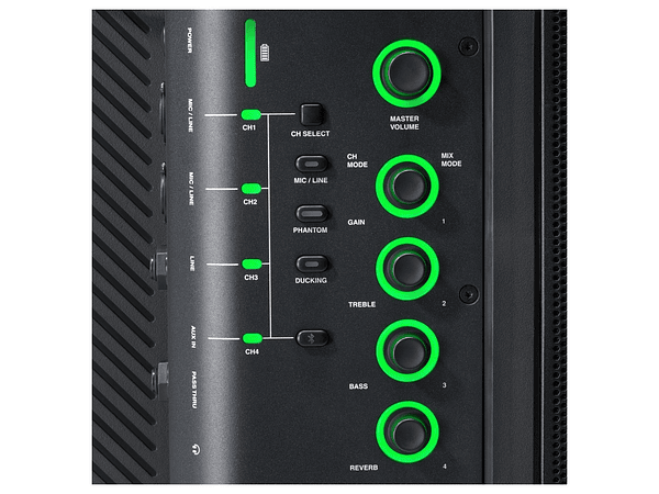 Entradas: 2 x combo XLR-1/4 (micrófono / línea), 1 x 1/4" (Hi-Z), 1 x 1/8" (auxiliar).